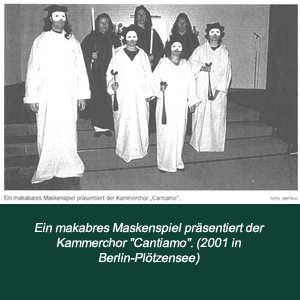 Auf der Suche nach neuen Gestaltungsmöglich- keiten für Chorkonzerte betritt der Chor zuweilen auch ungewöhnliches Gebiet, so etwa mit einer szenischen Umsetzung von Hugo Distlers Totentanz, der mit Leonhard Lechners Deutschen Sprüchen von Leben und Tod kombiniert wurde.